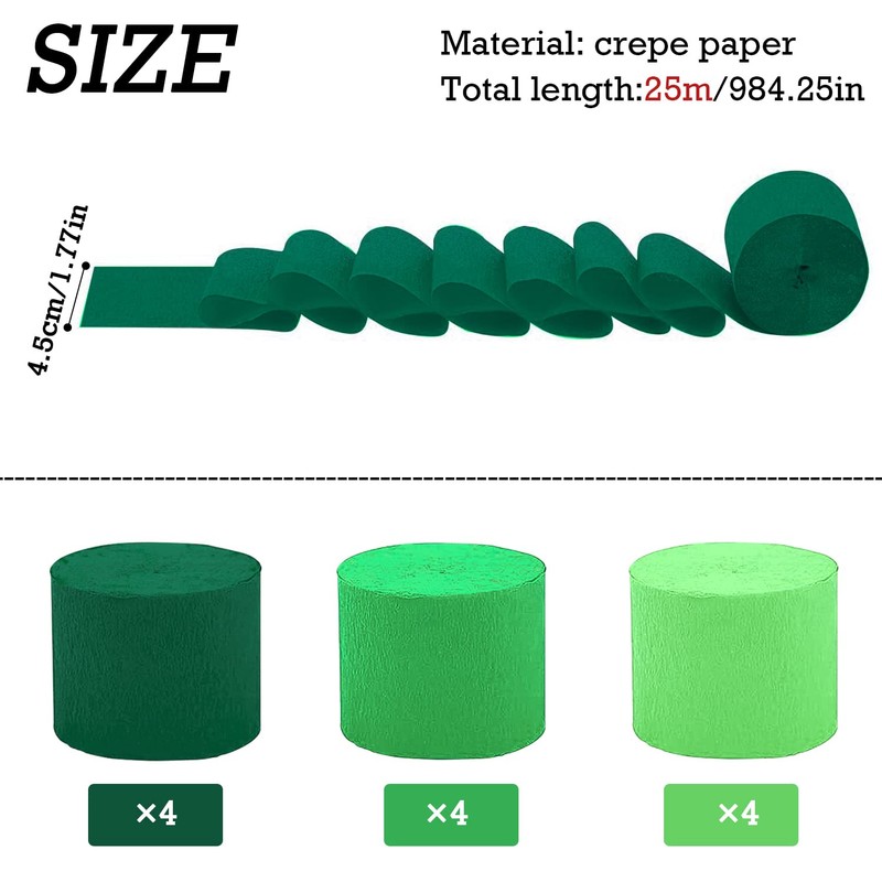 - 12 rolls of crepe paper: crepe paper green tones 12 rolls. 25 metres x 4.5 cm each. 25 m of each roll is enough for you to decorate the party, as party streamers or to decorate your home.
