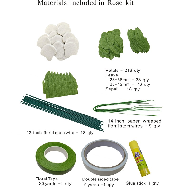 • Materials included in this kit: Petals - 216 qty Leave: 28*56mm - 38 qty 23*42mm - 76 qty Sepal - 18 qty 14 inch paper wrapped floral stem wires - 9 qty Glue stick-1 qty 12 inch floral stem wire - 18 qty Floral Tape 30 yard- 1 qty Double sided tape - 1 qty