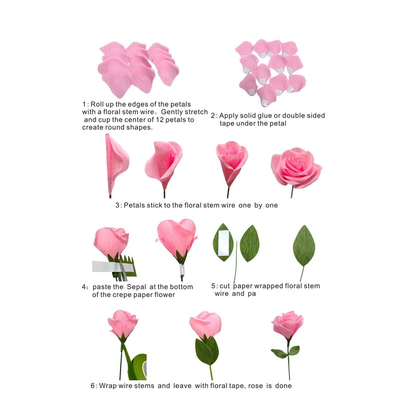 • Crepe paper flower kit contains crepe paper and floral stem wire, paper wrapped floral stem wire, floral tapes, glue stick, tutorial, which can make 18 crepe paper rose flowers.