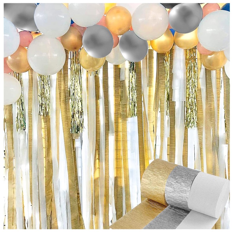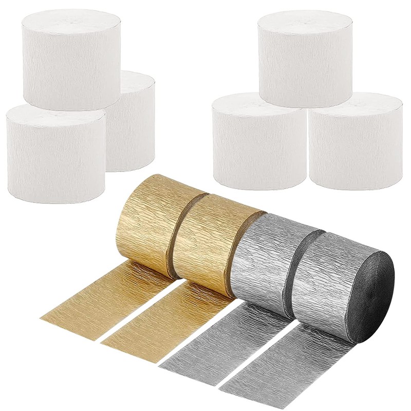 - 10 rolls of crepe paper: 3 colours, 6 crepe tapes white, 2 rolls gold, 2 rolls silver, each 25 metres x 4.5 cm. 25 m of each roll is enough for you to decorate the party, as party streamers or to decorate your home.