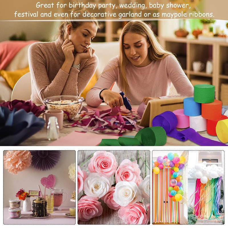 - Wide Application These crepe ribbons streamers fit any occasion. You can use it to make cute crafts to send your friends and family. You can hang them on the ceiling, wall or window, above a table, under the porch roof, or from branches in trees. Ideal for birthday party, wedding, baby shower, festivals and even for decorative garlands or as maypole ribbons.