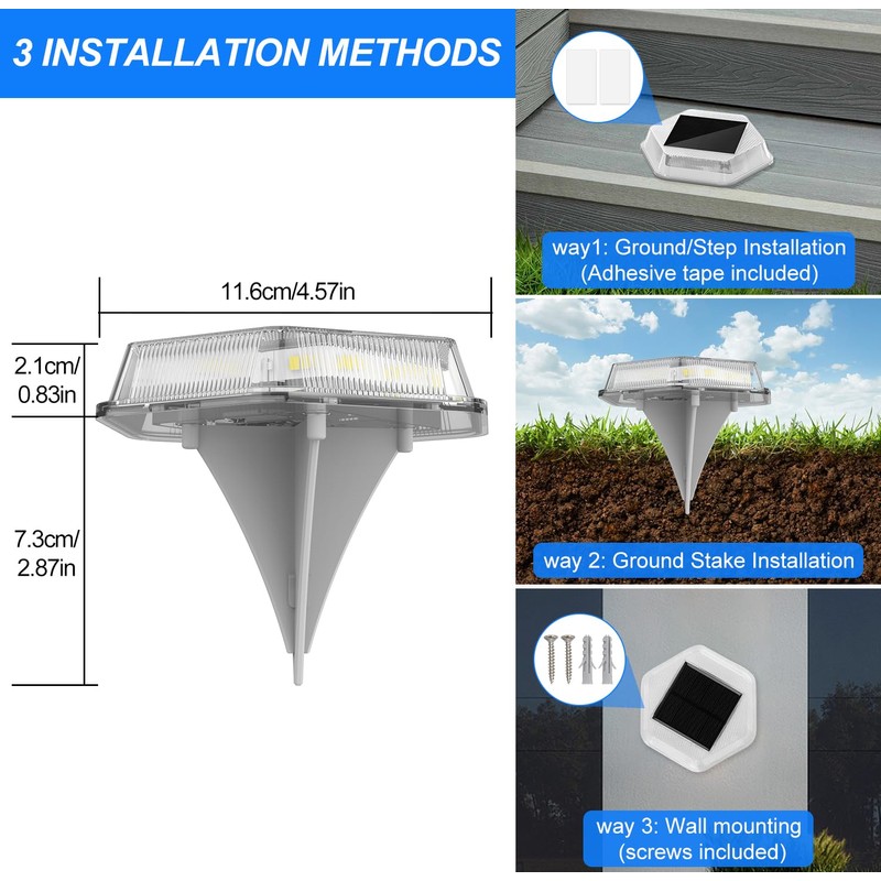 - 【3 types of installation】 Led Solar Dock Lights can be quickly installed in any ground where it can absorb the sun light directly. There are 3 mounting options: 1. Use screws to mount on walls, fence wood posts 2. Use ground stakes to mount on lawns, gardens 3. Use double sided tape to attach to concrete pathways, decks, stairs, driveways, patios. (Package does include 8 adhesives). Widely used for docks, decks, pools, steps, pilasters, porches, landscaping, pathways, patios, yards, gardens.