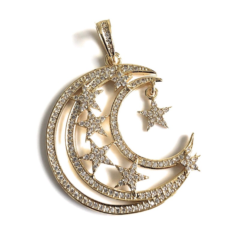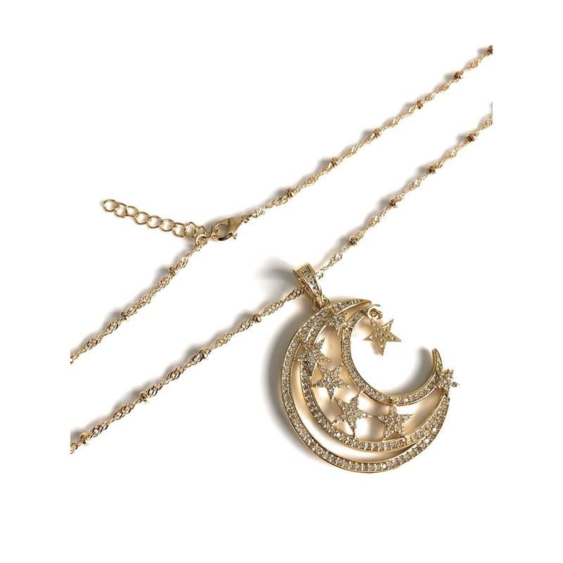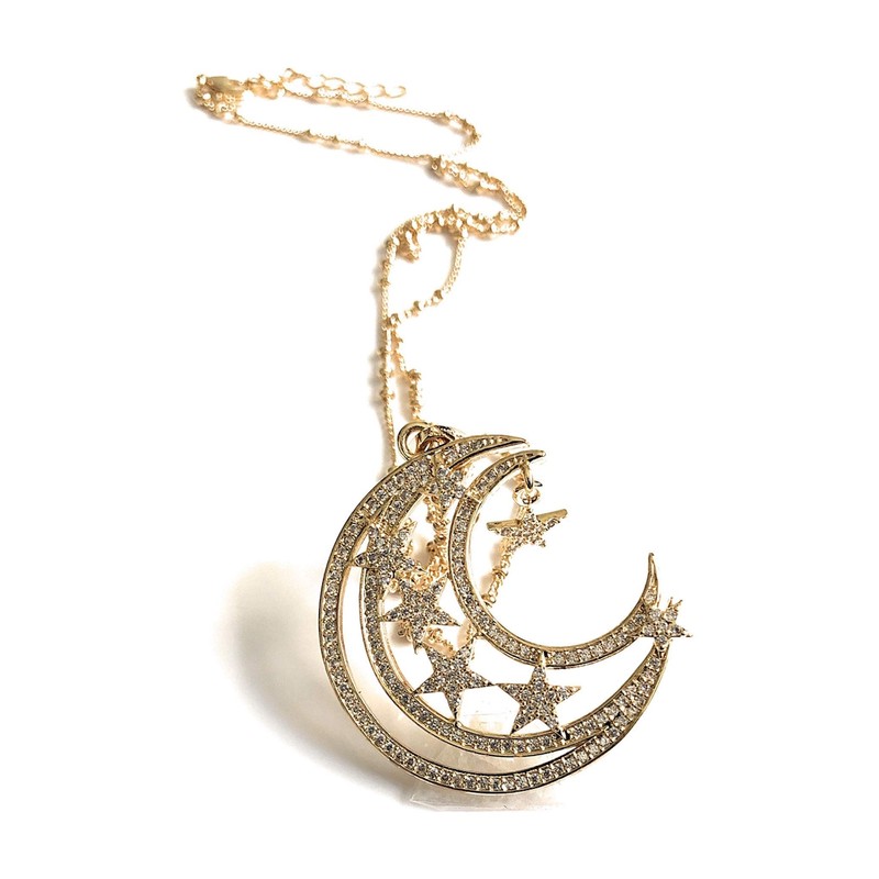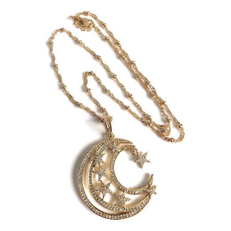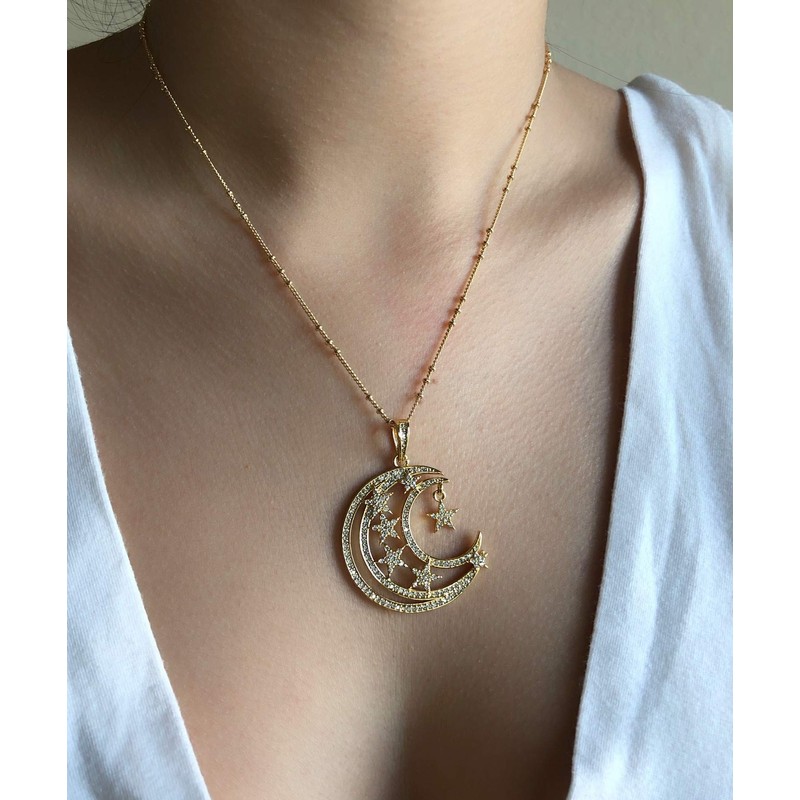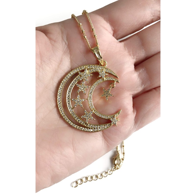 Crescent Moon and Stars Necklace 17.5 Inches Sattelite Chain