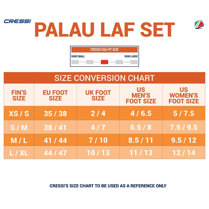 - Palau is available in 5 sizes that cover shoe sizes from 32 to 47