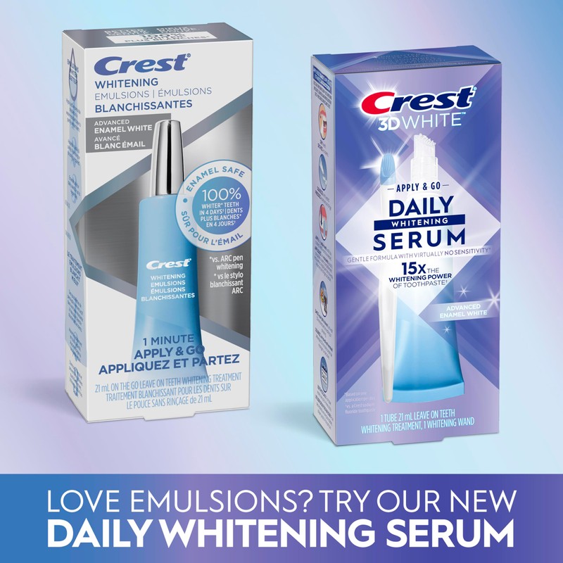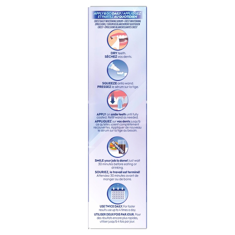 If you liked Crest Whitening Emulsions you will love Crest 3DWhite Advanced Enamel White Daily Whitening Serum. The Daily Whitening Serum swipes on easily and its gentle formula provides virtually no sensitivity. Crest 3DWhite Advanced Enamel White has 15x the whitening power of toothpaste and is enamel safe for daily use, no rinsing or brushing required. Use twice daily. For faster results use up to 4x a day! Just squeeze, swipe, smile, and forget the stains. Get 100% whiter teeth in 4 days with Crest 3DWhite Daily Whitening Serum.based on one application per dayvs. a Crest sodium fluoride toothpastevs. ARC pen whitening apply 4x/day