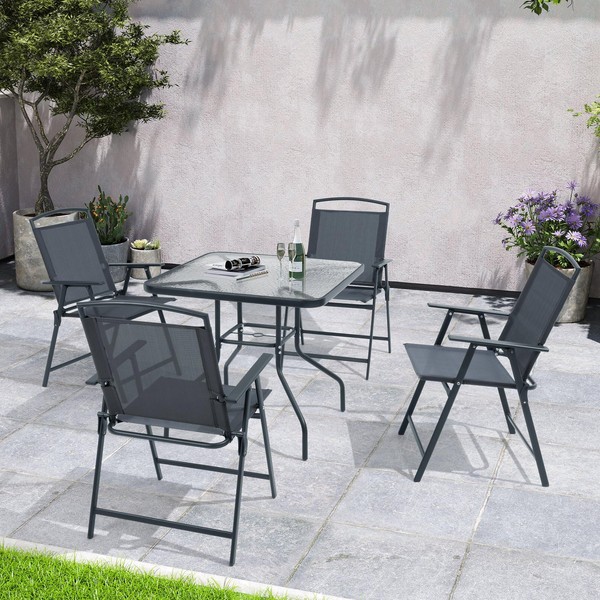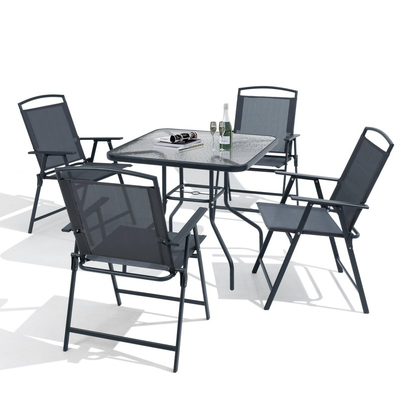 Crestlive Products 5 Piece Patio Dining Set with 4 Folding Chairs and Table Outdoor Dining Furniture with Square Glass Tabletop, Umbrella Hole for Bistro, Garden, Backyard, Deck(Grey)