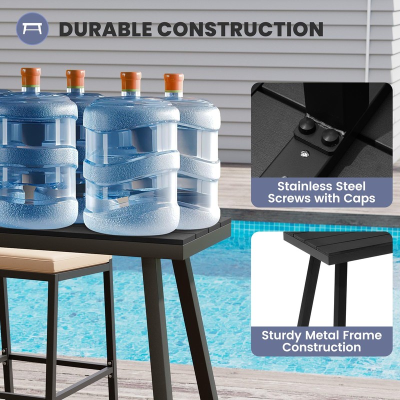 - Refined Bar Table: The wood-like tabletop is thicker and more spacious. Slatted tabletop is eco-friendly, UV-resistant, wear-resistant, and easy to maintain. Also, the thicker metal legs of the chair are more sturdy and durable. Will perfectly fit outdoor and indoor decor.
