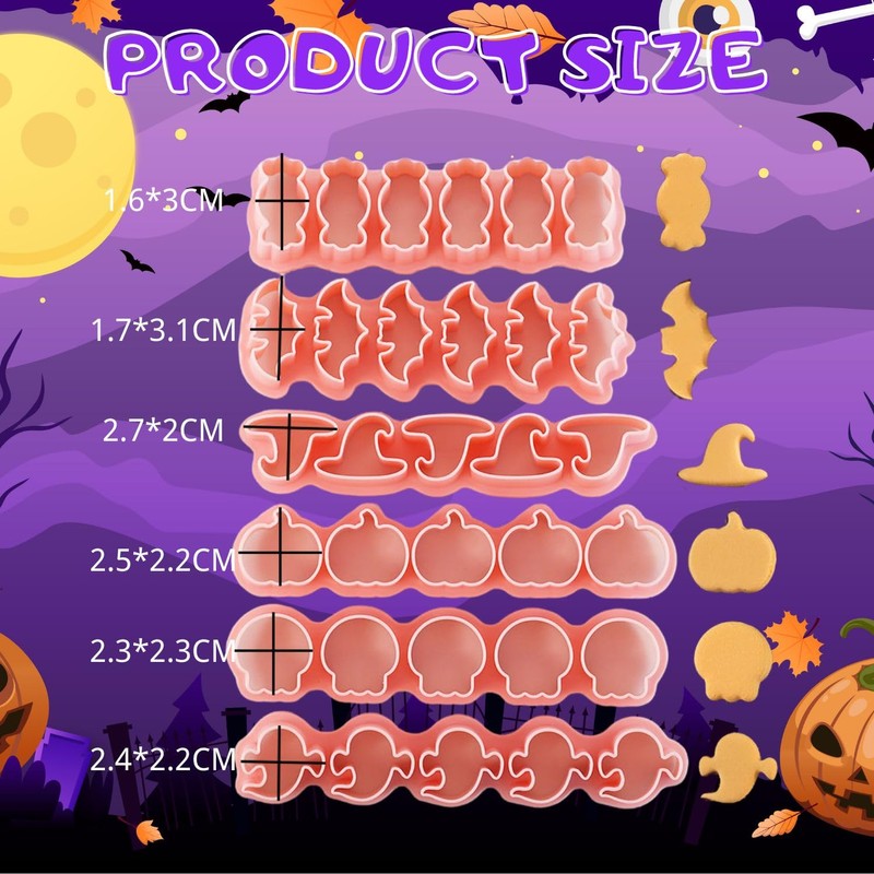 - Various Shapes and Packaging - Includes 6 different shapes of mini cookie cutters: Pumpkin cookie cutter, Skull cookie cutter, Bat cookie cutter, Ghost cookie cutter, Wizard Hat cookie cutter, and Candy cookie cutter.