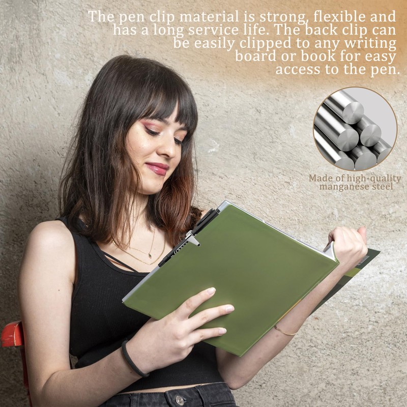 2.The pen clip material is strong, flexible and has a long service life. The back clip can be easily clipped to any writing board or book for easy access to the pen.