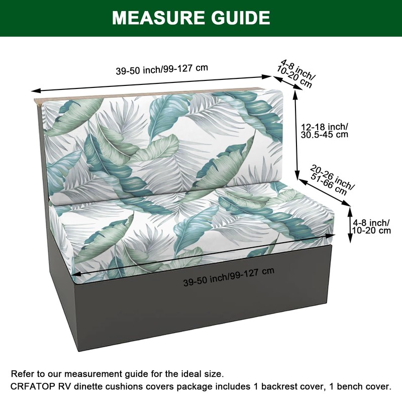 - Camper Bench Seat Covers Size: CRFATOP RV dinette cushions slipcovers package includes 2 backrest cover, 2 bench cover. The cushion covers fits the length 39-50 inch; width: 20-26 inch; thickness: 4-8 inch; The bench cover fits the length 39-50 inch; width: 12-18 inch; thickness: 4-8 inch. They're designed to be a snug fit for most loveseat sofas. To guarantee a flawless fit, we recommend measuring your cushions before making a purchase.