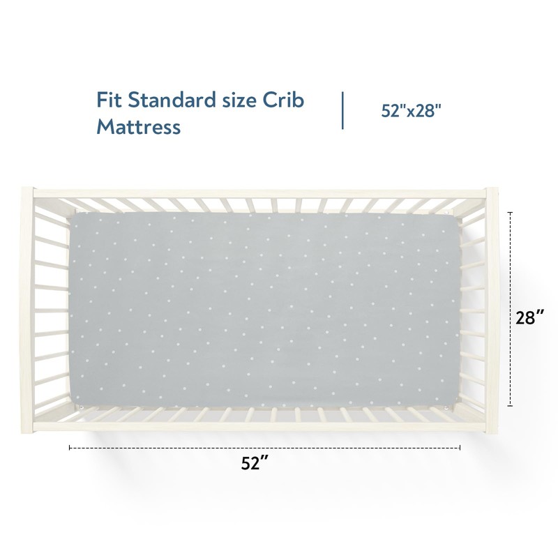 - Fitted Sheet : Measures 52”X 28”, our crib sheets can snug fit most standard crib and toddler bed mattresses. The deep pocket skirt stretches up to fit 8 inches deep mattress, provides a safe and secure 360 degree coverage and protection for your mattress.