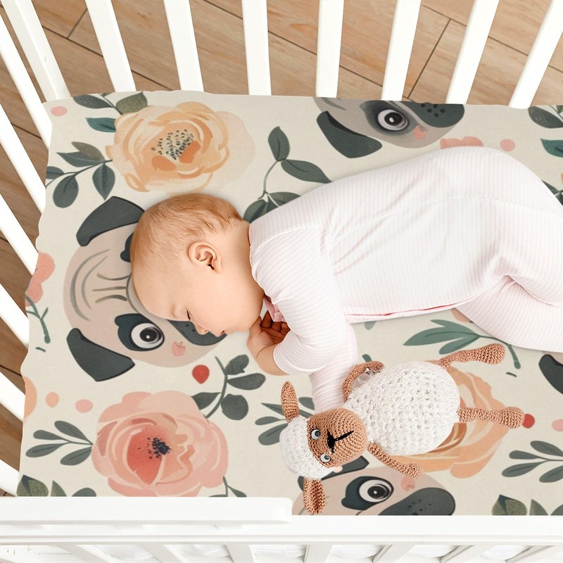 Crib Sheets Pug Dog Flowers Stretchy Portable Sheets for Baby Toddler Breathable Soft Crib Mattress Sheet for Girls Boys