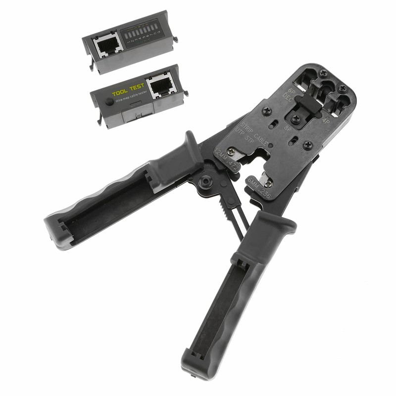 It is a robust tool crimping RJ9, RJ11, RJ12 and RJ45 cables. Compatible with connectors4-pin, 6-pin and 8-pin it has 3 holes compatible with the format of these connectors. It also has blades for cutting and stripping cable sheath. These blades can be calibrated for precise cutting and weeding. It has rack mechanism for locking the tool until you reach the end of the tour or depressed. In mangoes has two modules testers cable. These modulesare removable.