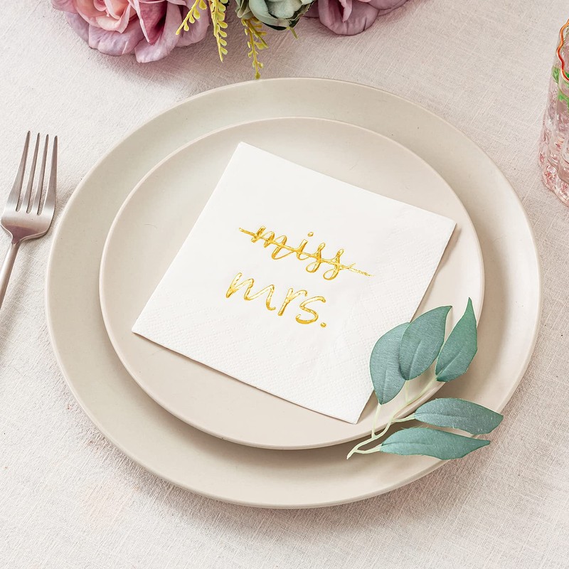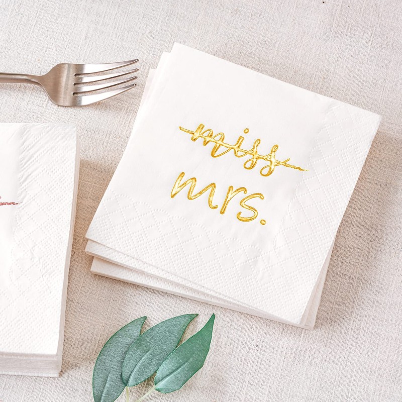 - Servilleta blanca con texto estampado de lámina dorada: miss to Mrs!
