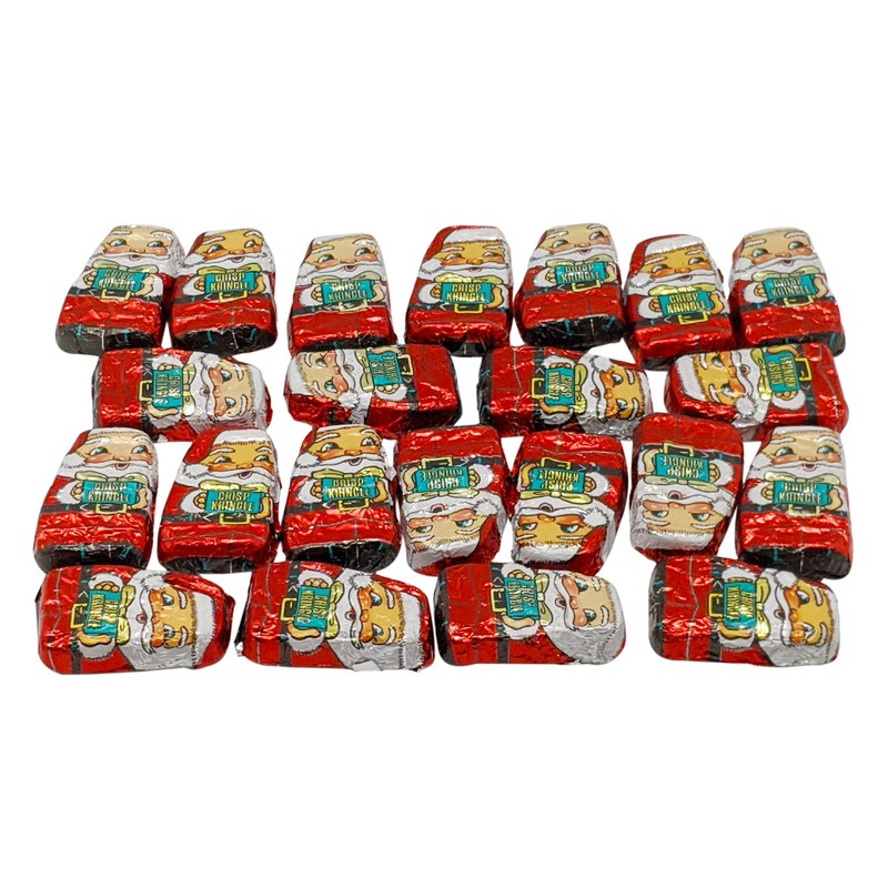 • Each crispy chocolate is wrapped in a artfully decorated foil wrapping featuring Santa Claus. Under the foil is a molded chocolate in the likeness of Chris Kringle.