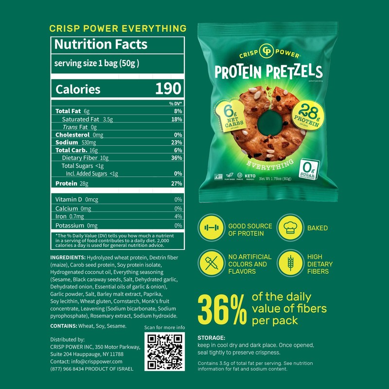 • Maximize Protein Intake with Crisp Power Protein Pretzels. Indulge guilt-free: No Sugar, Keto & Vegarian, kosher, non-GMO. The perfect satisfying bite after workouts & between meals.