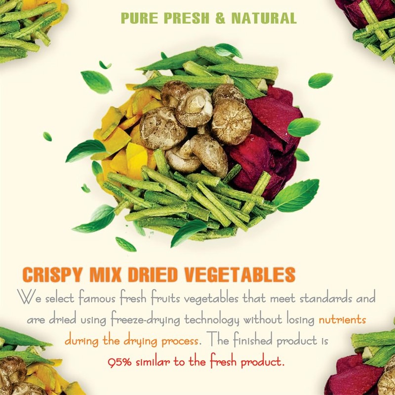- 🌱 [Crispy Mix Dried Vegetables]: Naturally crispy and sweet, no added sugar or artificial ingredients. Not only is this product a favorite daily snack for many, but it also adds a beautiful and appealing touch when used to decorate dishes.