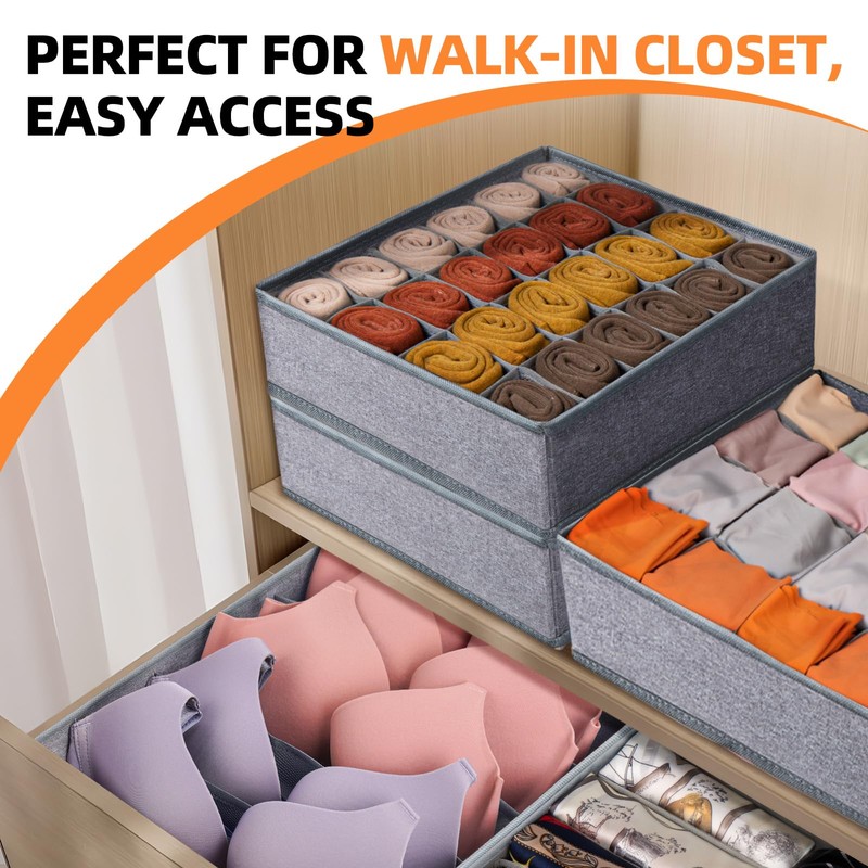 - 【90 LARGE COMPARTMENTS】Unlike other sock organizers with small sections, our clothes organizer features slightly larger compartments in 3 sizes to better accommodate various under-clothes storage and space saving needs. It's perfect for men’s boxers, winter socks, women’s bras up to C cup, yoga leggings, hair accessories, ties, scarves, belts, yarns and even small Christmas ornaments.