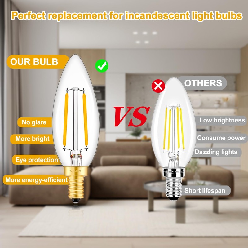 • ★ Bombillas LED de 2700 K de color blanco cálido: estilo antiguo B10 con forma de torpedo de vela en forma de bala, brillo blanco cálido de 2700 K, patrón de luz igual que las bombillas incandescentes, bombillas de temperatura de color de 2700 K producen un ambiente cálido, amigable, personal, íntimo y cómodo, ángulo de haz de 360 grados, menos calor e instantáneo
