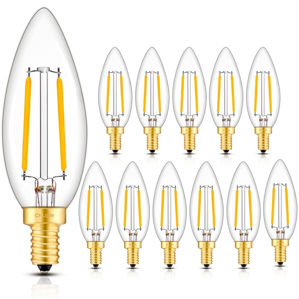 CRLight foco LED para candelabro de 2 W, 250 lm, 2700 K, blanco cálido, base E12 equivalente incandescente de 25 W, bombillas LED regulables, con forma de torpedo de vidrio transparente B10, ángulo de haz de 360 grados, paquete de 12 unidades
