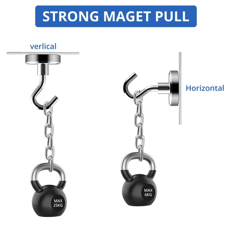 - Magnetic hook extra strong: our magnetic hook diameter of this 25 mm diameter, can hold a maximum weight of 25 kg, when used vertically. Not suitable for use on stainless steel, wood, plastic, glass, copper or gold. The thicker the iron, the stronger the attraction.