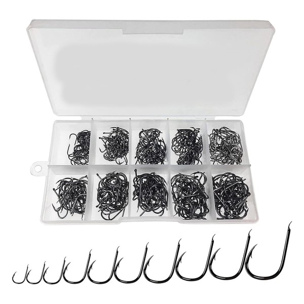- Ten sizes: A total of 100 fishing hooks with eyes in 10 sizes are packed in separate boxes for easy use and portability. ; Different sizes can meet different fishing needs.