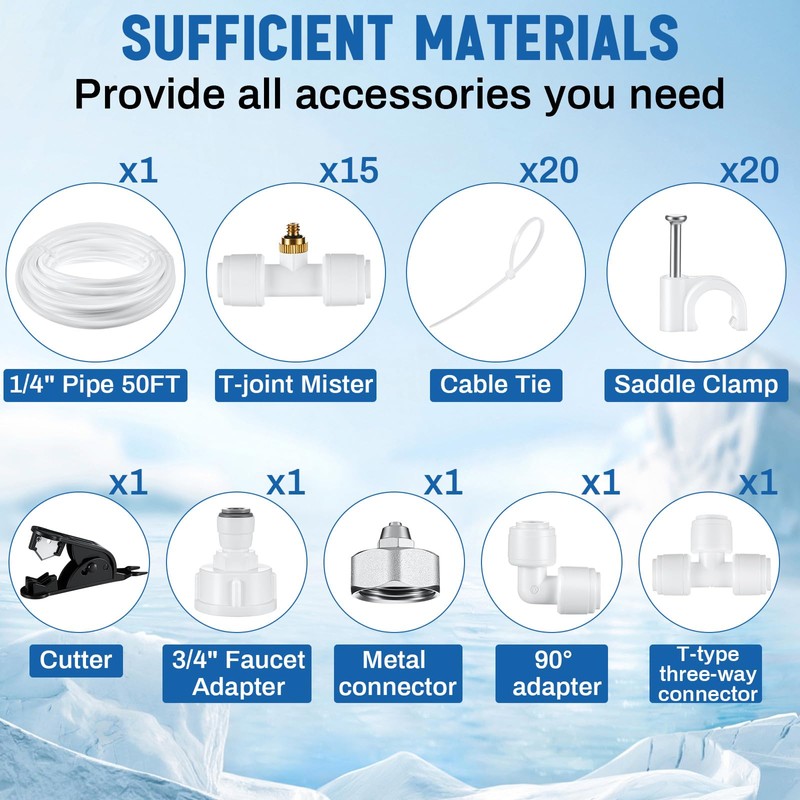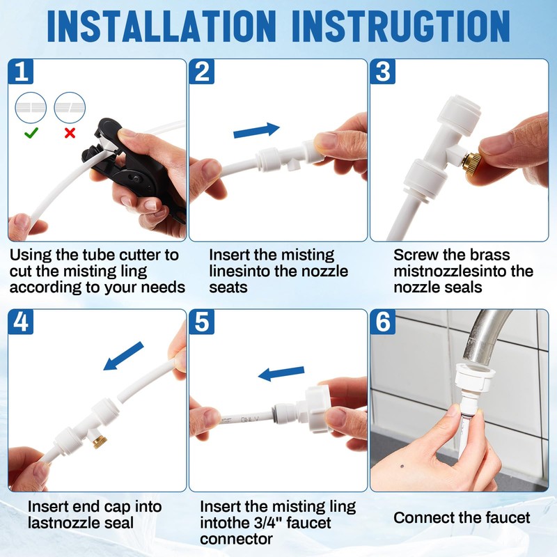 • Effortless Installation: pre assembled for your convenience, simply insert the rubber filter, connect to a faucet or garden hose, and secure the fogger tube using hose clamps or cable ties; No additional tools or extensive time required, making it ideal for cooling your backyard, deck, gazebo, porch, garden, and more