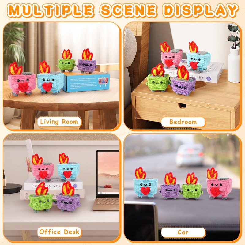 - CROCHET DUMPSTER FIRE: The crochet starter kit could crochet 4 cute dumpster fire(no card), loved by many. It will gently heal your heart as you crochet. The warm finished product can be used as a decoration and placed in the study room, living room, bedroom lamp, etc
