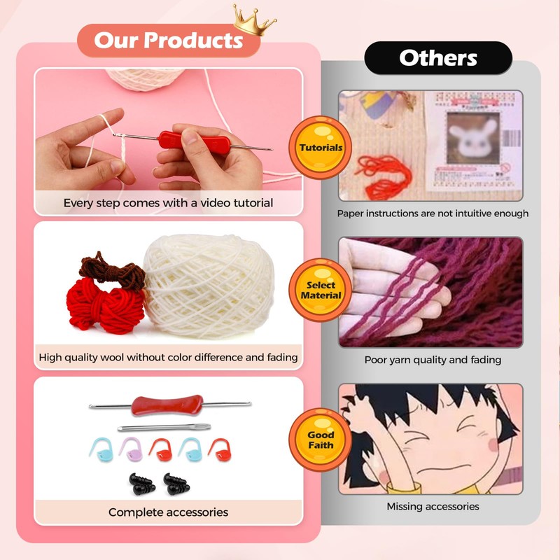 - ✨【Everything Included – No Extra Supplies Needed】This all-in-one kit comes with: Ergonomic crochet hook (comfortable grip), Beginner-friendly yarn (soft & easy to work with), stitch markers, safety eyes, stuffing & a blunt needle, beginner’s guide with photos and video tutorials.