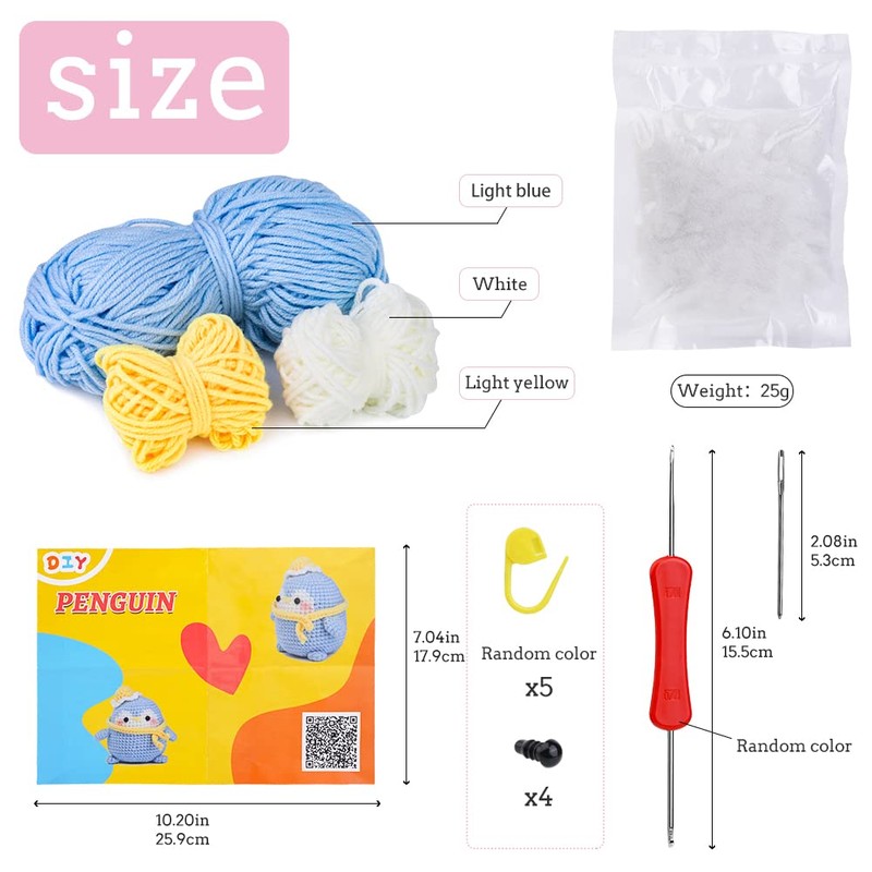 - Complete Crochet Kit: Our crochet pack has complete accessories, a crochet kit can make a cute animal. Our Crochet Kit for Beginners has a double-ended crochet hook (random color), 5 pcs stitch markers (random color), a big eye blunt needle, 3 colors of yarn, 4 pcs eyes, 25g polyester fiber, instructions, and a storage bag. Beginners' crochet kit tools will easily make a cute doll.