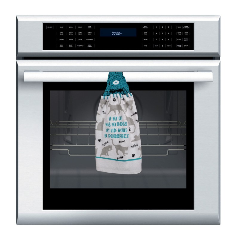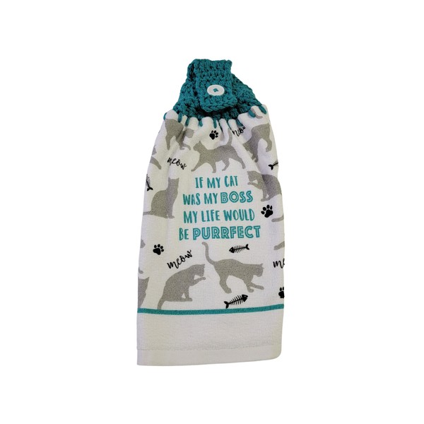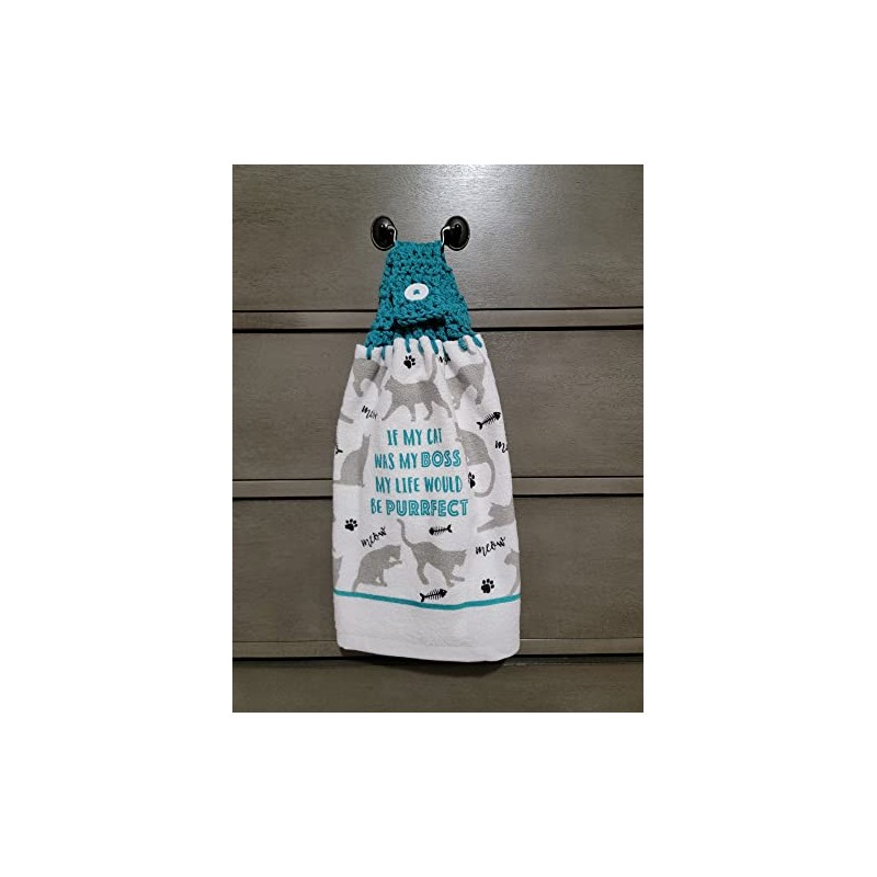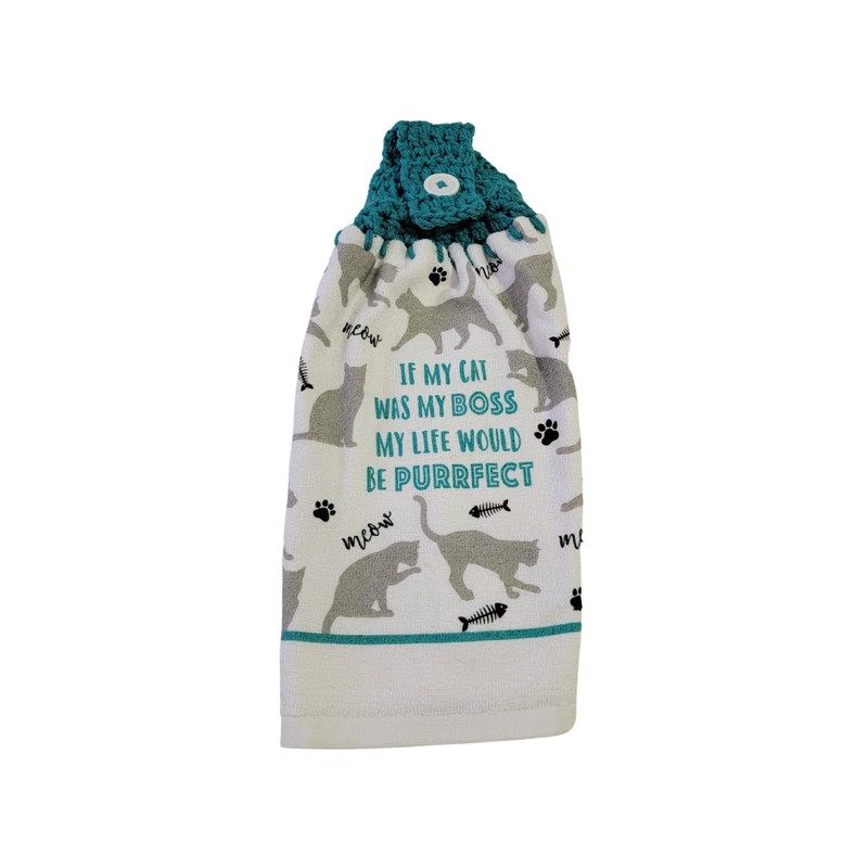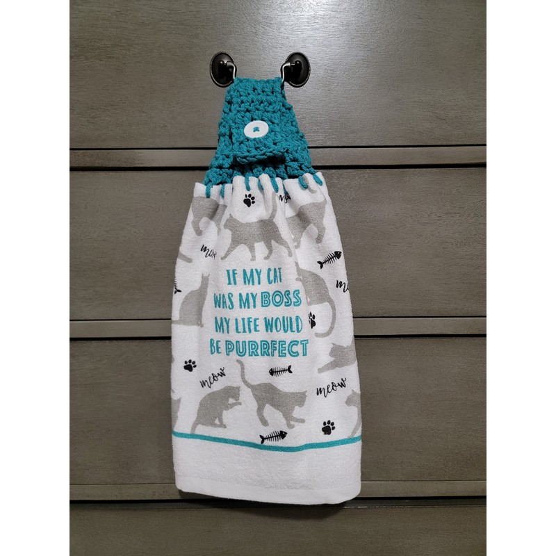 Crochet topped kitchen towel features a full cotton towel (15x25) folded in half for a double layer towel. Phrase reads "If my cat was my boss, life would be purrrrfect". Additionally, two strands of acrylic yarn are used when crocheting to achieve a fuller more durable top, completed with button closure. These towels are great for use in the kitchen and can be attached to oven handles, refrigerator doors, or cabinets. Towel can be machine washed and dried for easy care. Great for use anywhere you need a towel – kitchen, bathroom, baby room, mudroom, laundry room, basement…. The possibilities are endless!