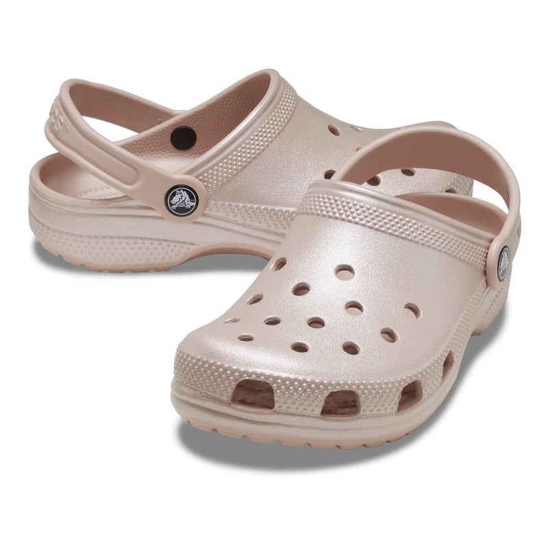• The Croc Kids Classic Glitter Clog looks chic and features an allover glitter detail. It offers comfort and the perfect look for your little one to have fun at parties.