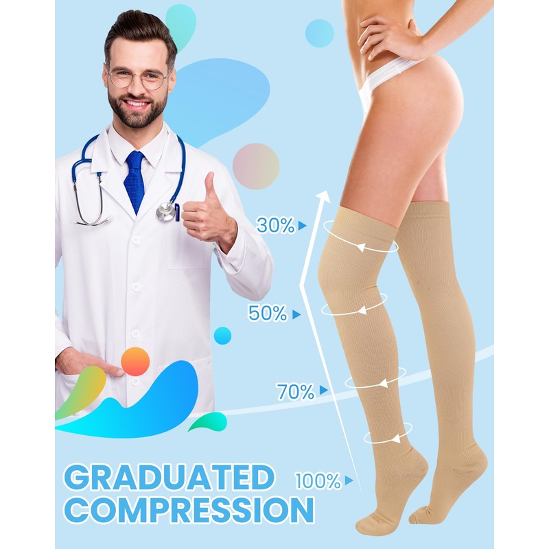 - Graduated Compression Socks: featuring a strong support design, these compression thigh high socks provide compression from ankle to calf, from bottom to top; This supports your veins, improves blood flow, reduces swelling, and helps prevent varicose veins, deep vein thrombosis, and other circulation issues; Embrace the relief and freedom of movement these socks provide