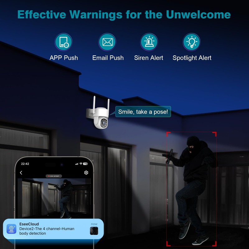 - 【Smart Tracking, Siren Alarm & Floodlight Alarm】The advanced camera supports to track both human body and object movement. When enabled the camera will begin to automatically record and follow it, emit a loud siren or flash dazzling white light in the darkness, send alerts to the APP in time.