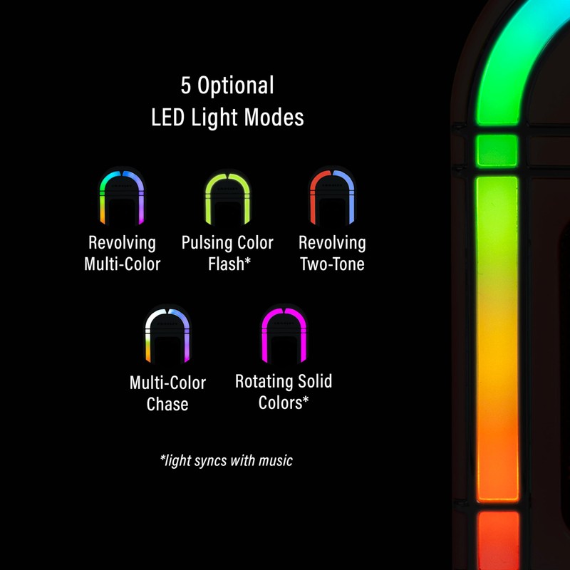 - SOUND AND STYLE: Designed to look like a classic jukebox, this portable speaker features LED lights with five color-changing modes and music sync technology.