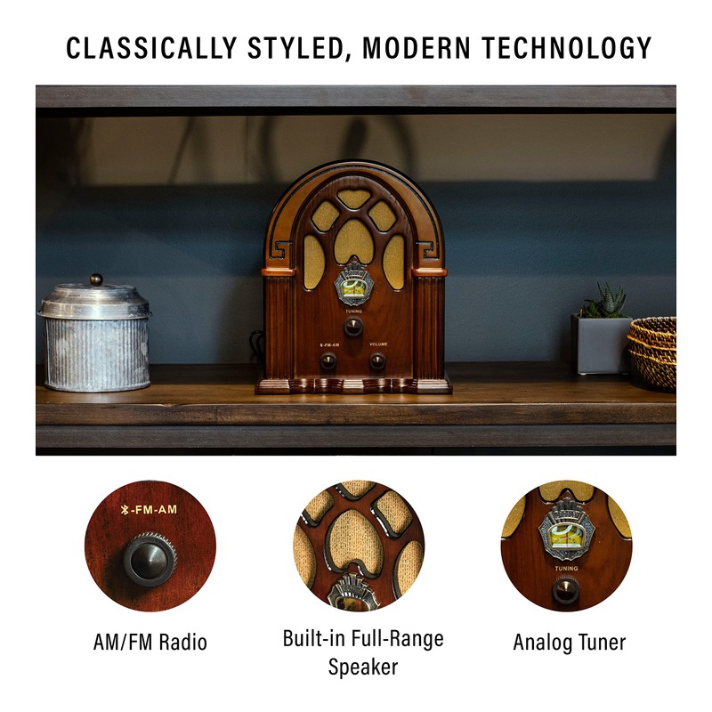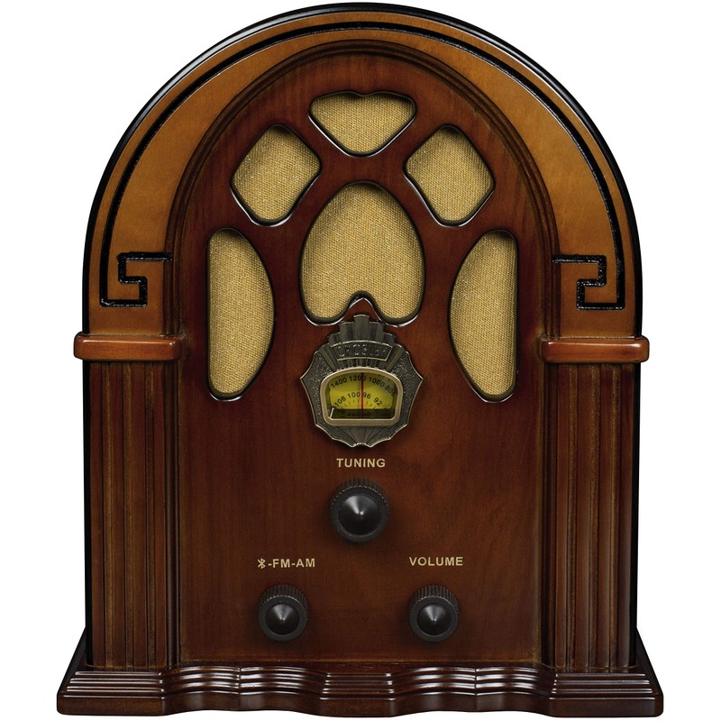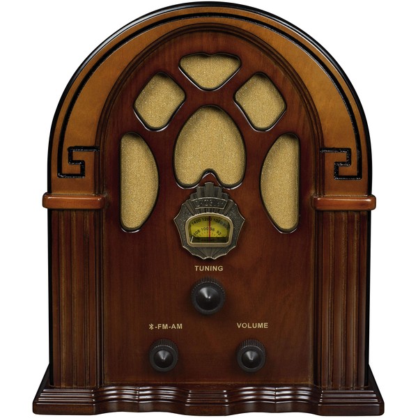 Relax with your favorite beverage and let the Crosley Companion Radio set the mood. Inspired by traditional cathedral cabinetry, this radio features AM/FM frequencies and Bluetooth to stream digital music through the built-in speakers. The cutout details, route lines, and fabric-covered speaker grill give the Companion its vintage look.
