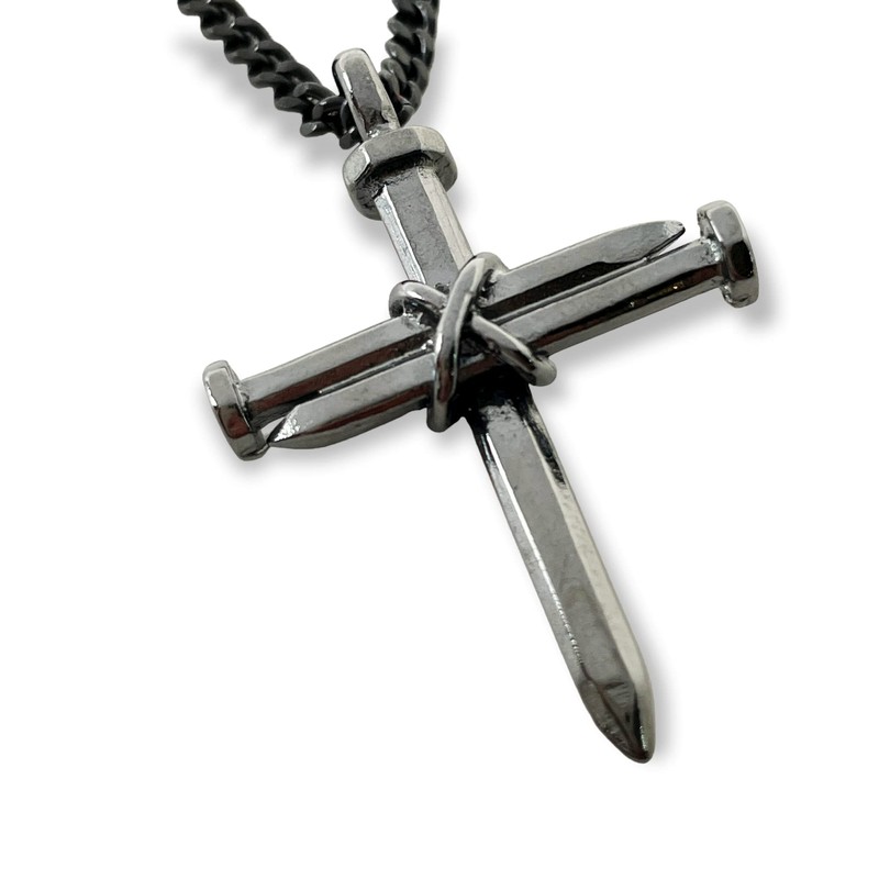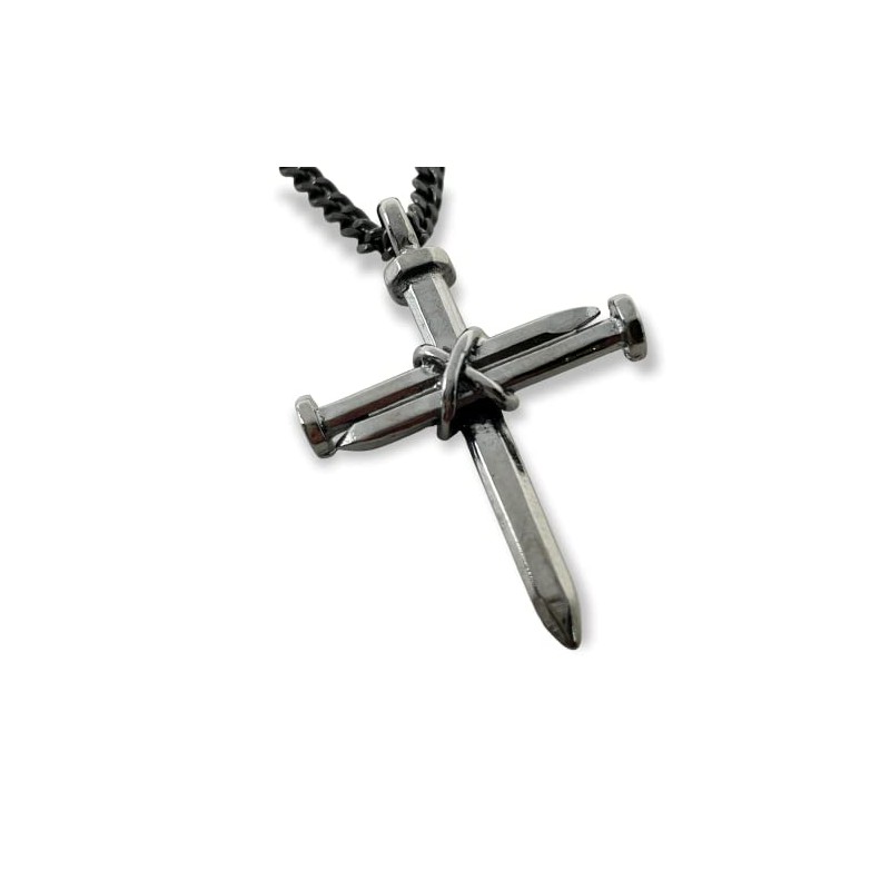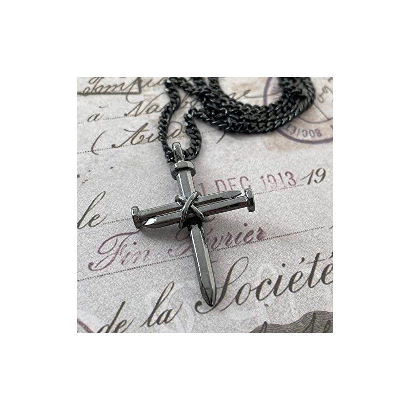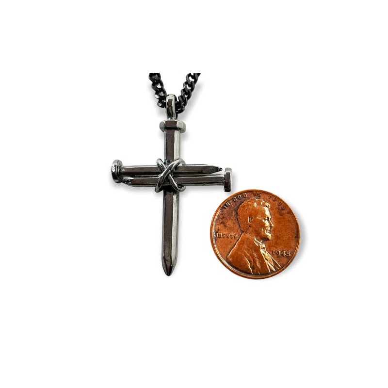 Dark Metal Finish Nail Cross on Dark Finish Chain Necklace - MADE IN THE USA using only lead free pewter - Rugged 3 Nail Cross with Dark Metal Finish - 24 inch Dark Finish stainless steel curb chain - Chain has lobster claw closure - Chain is extra strong and will not rust - Cross measures 1-1/4 INCHES long x 1 INCH wide - Made by a small family business who love America