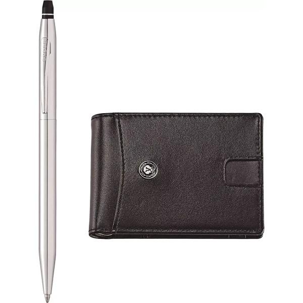 The gift set features a polished chrome click ballpoint pen and black leather wallet