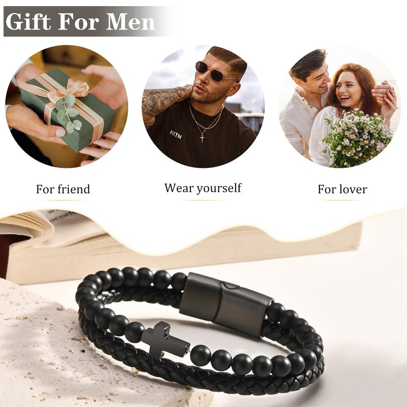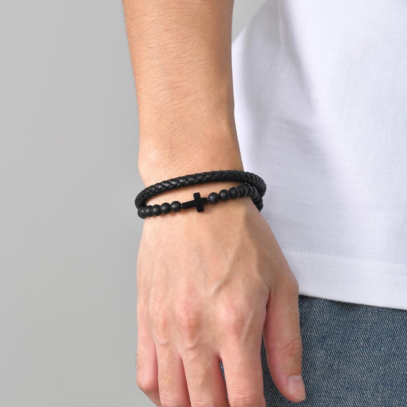 - Stylish Double-Layer Men's Bracelet: Elevate his look with this sophisticated men's bracelet. Features a top layer of braided black microfiber leather paired with a lower layer of matte agate beads and cross charms. A versatile piece of men jewellery (bijoux homme) for everyday wear.