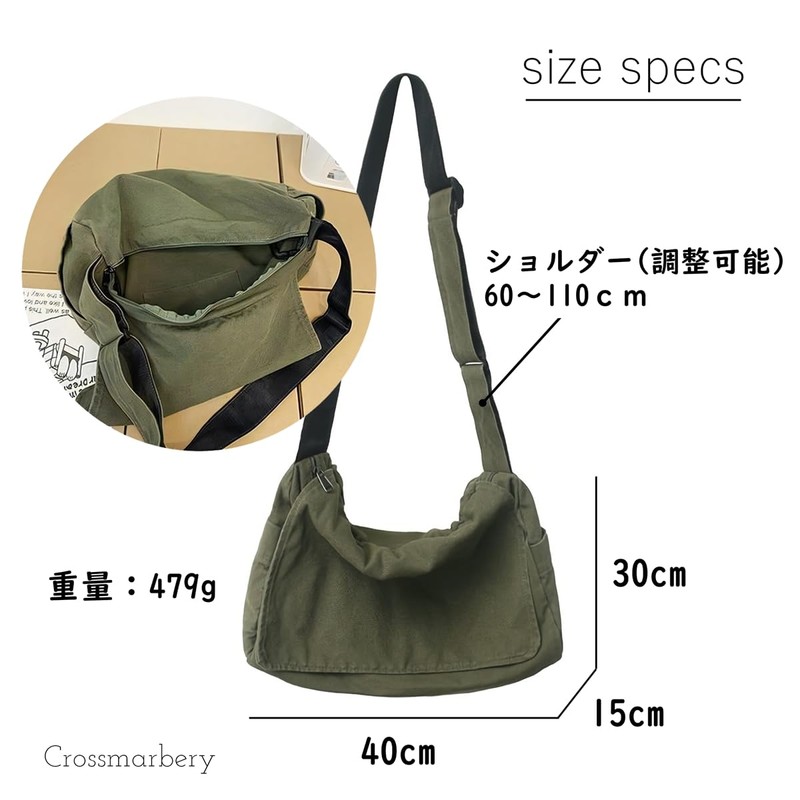 - Material: Canvas; Size: Width: 15.7 inches (40 cm), Height: 11.8 inches (30 cm), Gusset: 5.9 inches (15 cm), Shoulder Length: 23.6 - 43.3 inches (60 - 110 cm), (Adjustable); Weight: 16.9 oz (479 g); Closure: Zipper (with flap