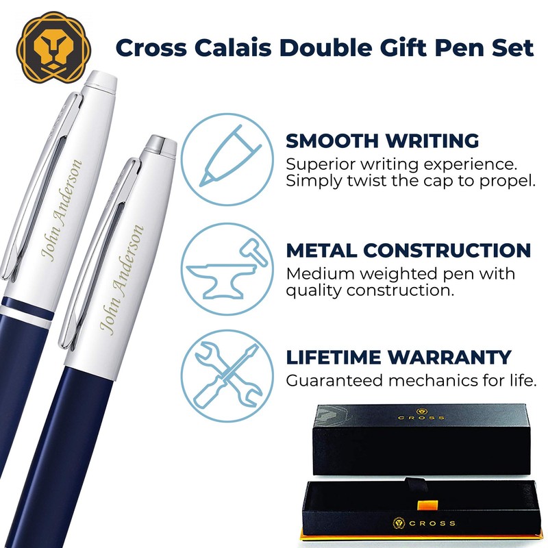 - A Cross Ballpoint Pen and Rollerball Pen Set with a Premium Finish: Authentic Cross Calais pen set with blue lacquer finish and polished chrome caps and trims.