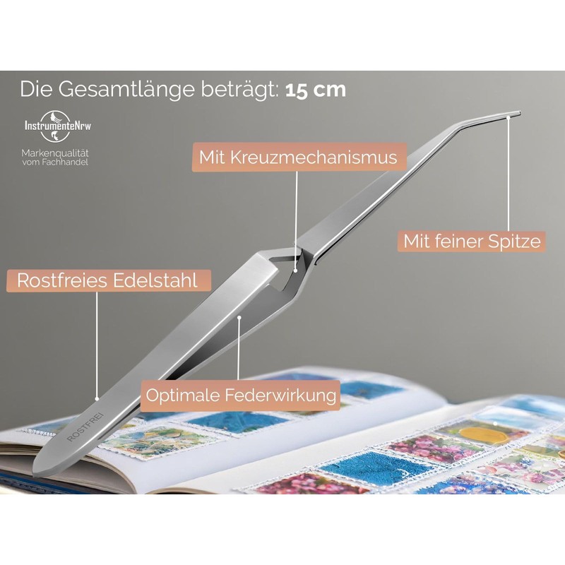 - Curved cross tweezers in 15 cm length with smooth mouth (without inner teeth) made of rust-proof stainless steel