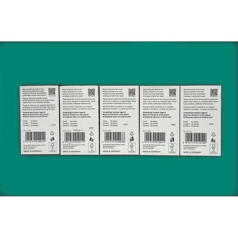 • Crottendorfer original quality: a pleasure of quality and dedication with the Crottendorfer incense cones in a set of 5, each with 24 pieces per pack. Incense cones in size M (H: 27 mm, D: 12 mm).