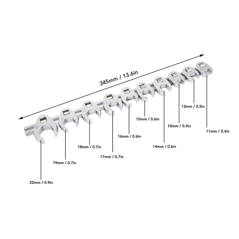 Function: The crows foot wrench set will allow for easy access to nuts and bolts in tight Spaces, 10 sizes for you to change at any time, making your work easier.