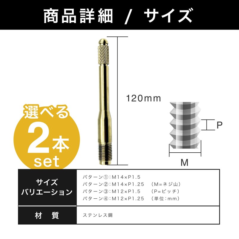 - Size: Total length 4.7 inches (120 mm); Weight: Approx. 4.2 oz (120 g); Screw standard: M14 / M12; Pitch: P1.25 mm / P1.5 mm; Color: Gold *4 variations available. Purchase according to your application