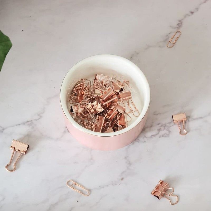 - Simple and Classic Paperclip Holders for Desk—— Round paper clip organizer with gold trim
