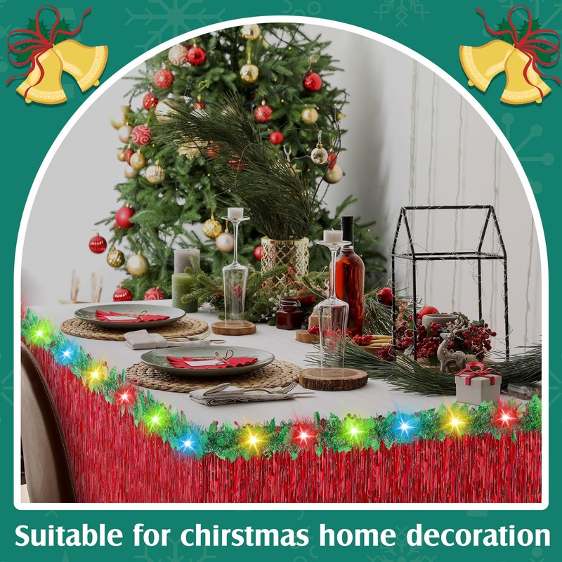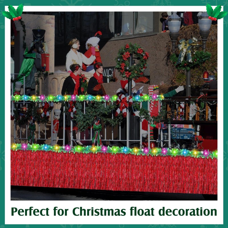 Crowye 8 Pcs LED Christmas Parade Float Decorations Set Foil Fringe Table Skirt and Tinsel Garland Shiny Metallic Tassel Banner for Trailer Glow Christmas Float Supplies(Red Green,Chic)