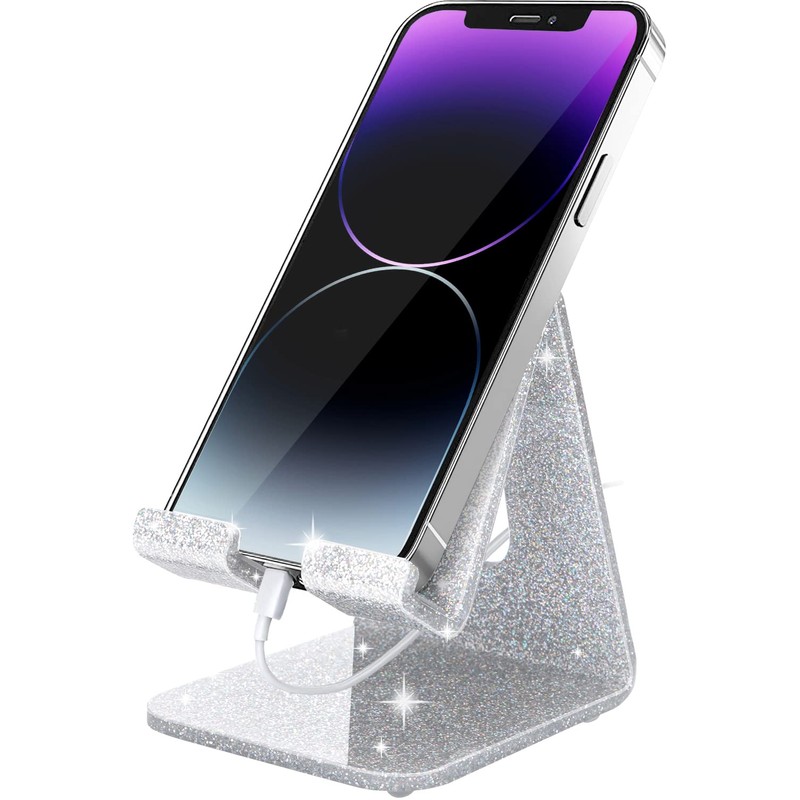 Crpich Acrylic Cell Phone Stand, Portable Phone Holder, Phone Stand for Desk, Compatible with Phone15 14 13 12 Pro Max Mini 11 Xr Plus SE, Switch, Android Smartphone, Pad, Tablet, Glitter Silver