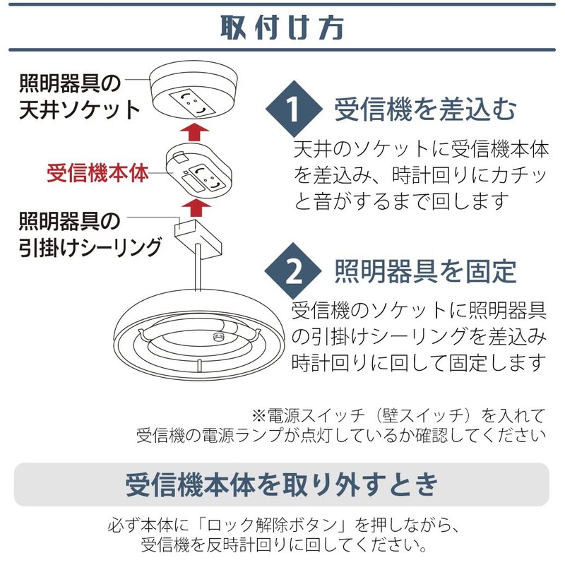 - The infrared remote control allows you to turn the light fixture on and off from a distance. ● Use the receiver between the lighting fixture and the ceiling hanging sealing. ● Includes a fixed lock function to prevent falling. ● Comes with a power lamp ● For pendant type lighting only
