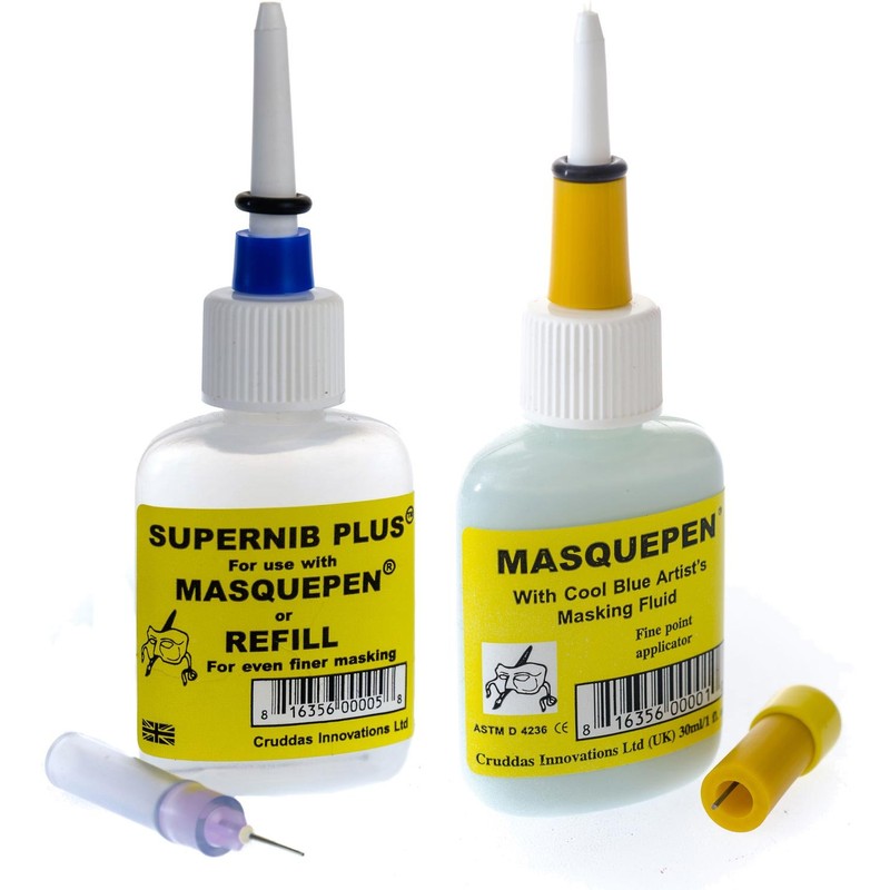 Now you have the control you've always wanted to bring your ideas to life in ways you once thought impossible. Use Masquepen to make a continuous line of liquid frisket and see what new creative worlds open for you.Draw straight lines or curves, thick or thin lines, small dots, stamens, snowflakes, and flowers with no mess no waste. The pale blue water-based latex solution is easy to see and apply. It peels off easily and does not damage the paper. It can also be used both under layers and on top of inks, watercolors, and acrylic washes.The stainless steel prong in the cap seals the .8 mm. nylon nib so the fluid won't dry out. Masquepen comes in a lightweight 1 oz. non-breakable bottle - it goes anywhere you want to go.Also Available:1 oz. Refills of the Masquepen masking fluid. Just switch tops and keep working.Supernib , an official Masquepen attachment. It's an ultra fine 0.5 mm. nylon nib that makes continuous spider web thin lines.Small Set , which contains one Masquepen with masking fluid, one 1 oz. cleaning bottle, and one Supernib.Large Set , which contains one Masquepen with masking fluid, one 1 oz. cleaning bottle, one Supernib, and one 1 oz. masking fluid refill.